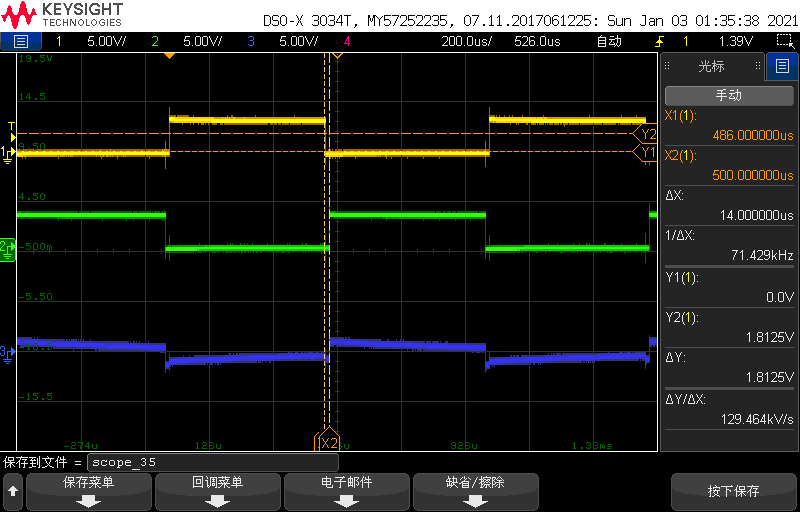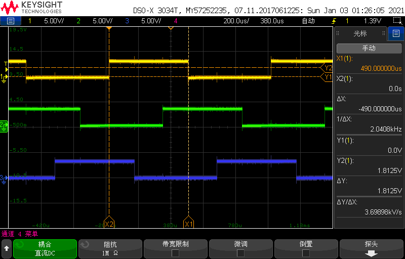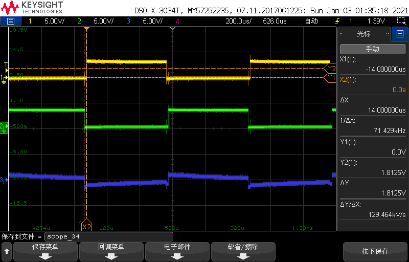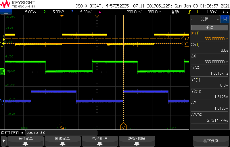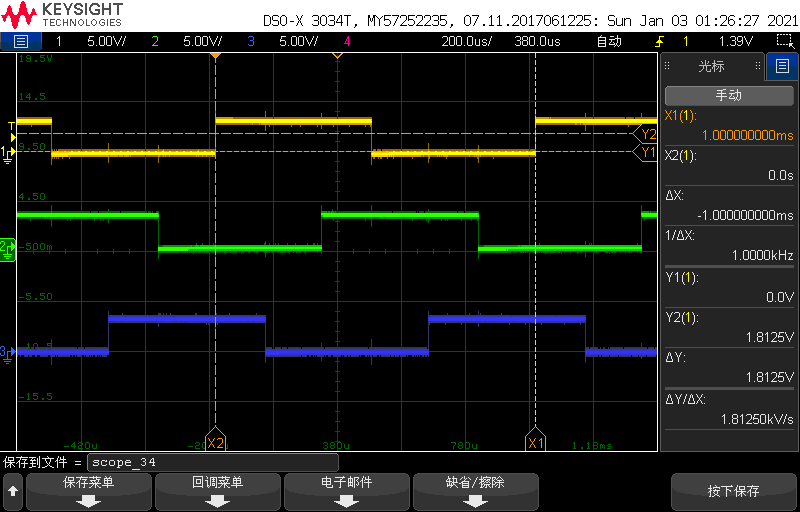 黄色:EPWM1A 绿色:EPWM2A 蓝色:EPWM3A 频率为1kHZ