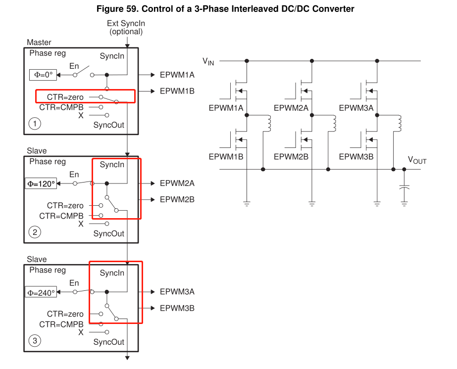 3.8 Controlling a 3-Phase Interleaved DC/DC Converter__控制三相交错DC/DC转换器_例子2:(使用方向EPwm2Regs.TBCTL.bit.PHSDIR位)