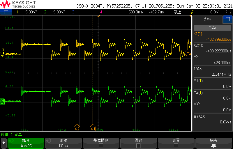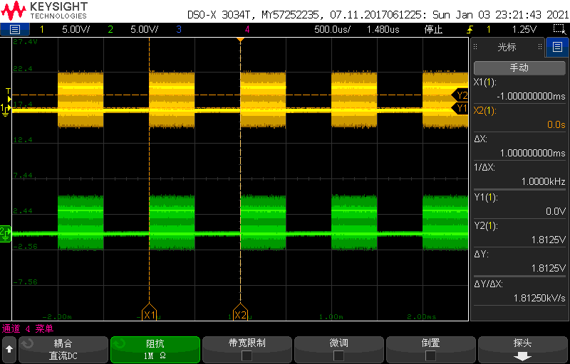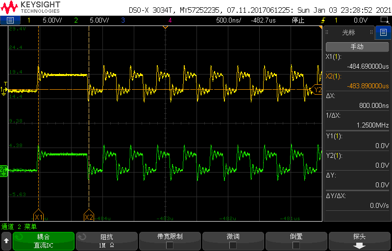 /* * 日期:2018-1-27 * 功能:对ePWM1A和ePWM1B这一对互补信号进行2.344 MHz的高频斩波, * 斩波模式占空比为50%,单触发脉冲宽度为800 ns */ void InitEPwm1Example() { EPwm1Regs.TBCTL.bit.CLKDIV = 0; // CLKDIV = 1 EPwm1Regs.TBCTL.bit.HSPCLKDIV = 1; // HSPCLKDIV = 2 EPwm1Regs.TBCTL.bit.CTRMODE = 2; // 增减计数模式 // ePWM1A 计数值等于0,置高电平。 // ePWM1A计数值等于PRD,置低电平。 EPwm1Regs.AQCTLA.all = 0x0060; // 增计数时,ePWM1B 计数值等于CMPA置高电平。 // 减计数时,ePWM1B计数值等于 CMPA 置低电平。 EPwm1Regs.AQCTLB.all = 0x0600; EPwm1Regs.TBPRD = 37500; // 1KHz PWM 信号 EPwm1Regs.CMPA.half.CMPA = EPwm1Regs.TBPRD / 2; // 50%占空比 EPwm1Regs.CMPB = EPwm1Regs.TBPRD / 2; EPwm1Regs.PCCTL.bit.CHPFREQ = 7; // SYSCLKOUT / 64(2的8次方) = 2.34375MHz EPwm1Regs.PCCTL.bit.CHPDUTY = 3; // 50% 占空比 EPwm1Regs.PCCTL.bit.CHPEN = 1; // 使能斩波模式 EPwm1Regs.PCCTL.bit.OSHTWTH = 14; // 120 *6.67 ns = 800 ns,第一个脉冲宽度 }