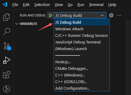 在 RUN AND DEBUG 下拉框里选择 JS Debug Build。选择完后,点左边绿色的调试按钮(三角形),项目会运行并停在 js 代码的断点处