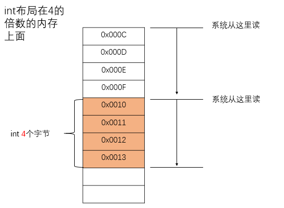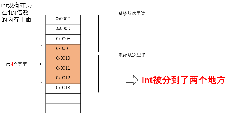 什么是数据对齐呢,就是某种类型对象的地址必须是K:1,2,4,8的倍数。比如说系统每次读取8的倍数,int类型占4个字节,如果这个int的起始地址不是4的倍数,那么就会将这个数读到两个不同的地方去。如图: