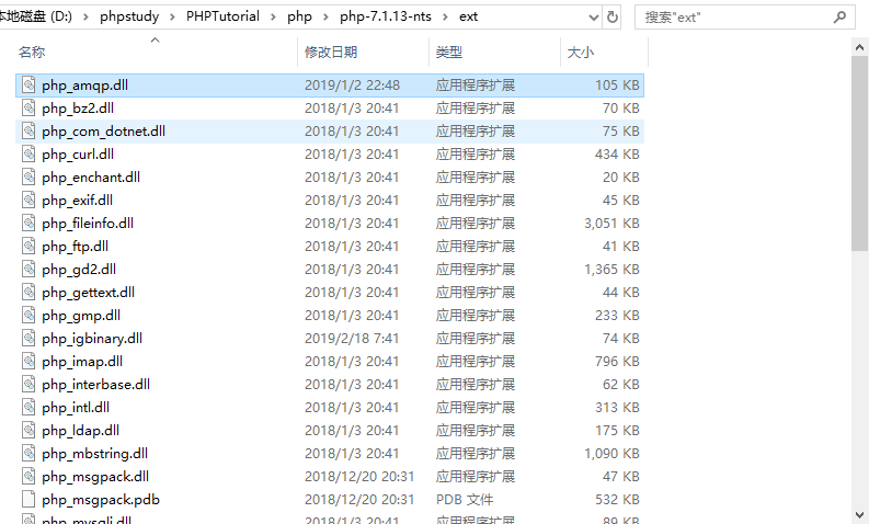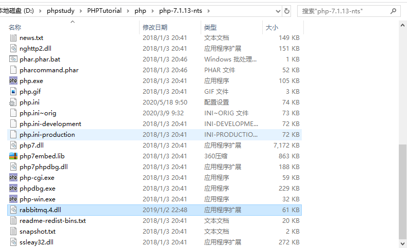 3、复制php_amqp.dll到php/ext, 如我的放到 D:\phpstudy\PHPTutorial\php\php-7.1.13-nts\ext目录下