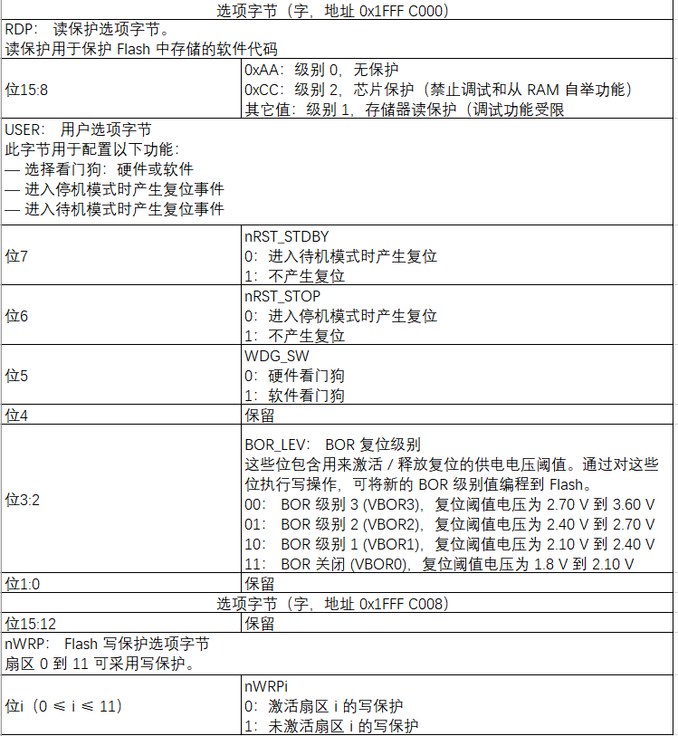 选项字节,读写保护,BOR水平,软件/硬件看门狗和复位当设置处于待机和停机状态。