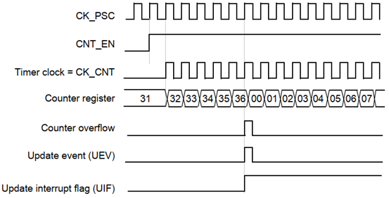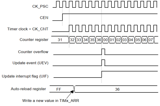 计数器时序图,ARPE=1 时的更新事件(计数器上溢)