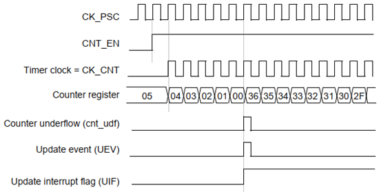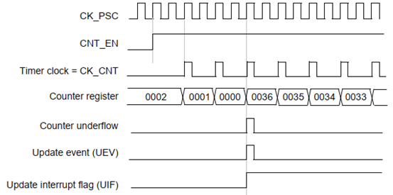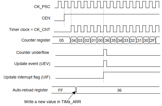 计数器时序图,ARPE=1 时的更新事件(计数器下溢)