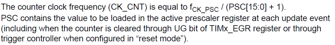 预分频器的缓冲区中将重新装载预装载值(TIMx_PSC寄存器的内容)
