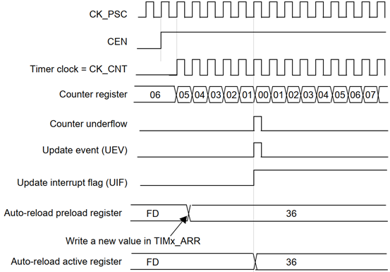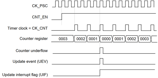 在向下计数模式中,计数器从自动重载值(TIMx_ARR寄存器的值)向下计数到0,然后从自动重载值(重新开始并产生一个计数器溢出事件。
