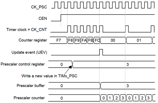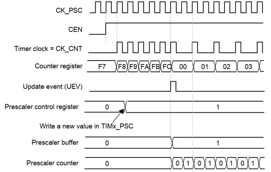 下图以一些示例说明在预分频比实时变化时计数器的行为。