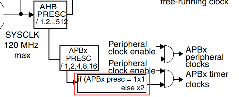 APB分频系数不是1,频率X2,APB输出的频率乘以2是APB下面时钟的频率。