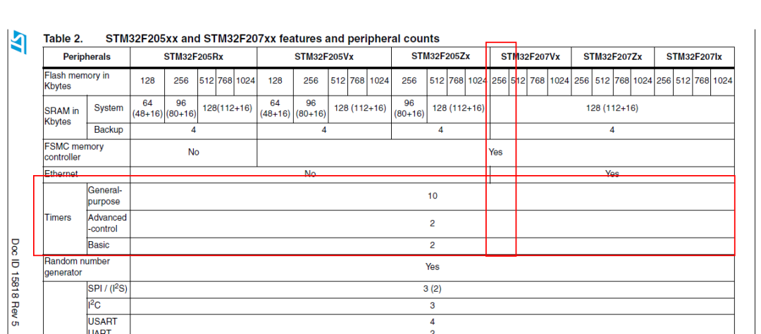 首先我们可以在STM32F207数据手册找到定制器的资源,从下图可以看到STM32F207一共10个通用定时器,2个高级定时器,2个基本定时器。
