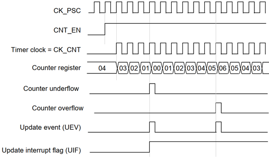 每次发生计数器上溢和下溢时都会生成更新事件,或将TIMx_EGR 寄存器中的UG 位置1(通过软件或使用从模式控制器)也可以生成更新事件。这种情况下,计数器以及预分频器计数器将重新从0 开始计数。