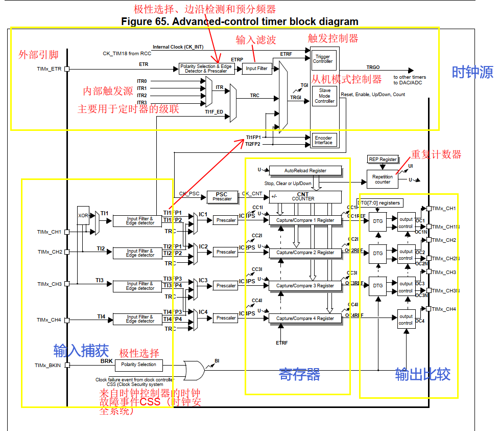 在STM32F207的用户参考手册中可以看到定时器的基本框图,下图是定时器1&8的看图。