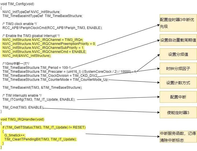 这里的值是分频系数=TIM3CLK/定时器实际频率,所以定时器频率是10000,也就是说除数就是定时器频率。一个clk是1/10000s。定时时间=1/10000*定时器重载值。根据上面的配置,定时器重载值是100,也就是定时器中断周期是=1/10000*100=0.01s=10ms,也就是100HZ。