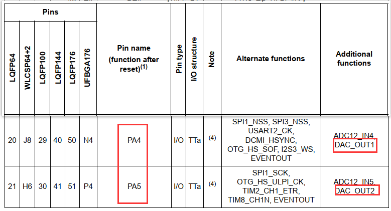 每个DAC具有独立的通道,对应的GPIO分别为:PA4和PA5。对于GPIO的复用功能(Alternatefunctions)和附加功能(Additionalfunctions),在《STM32ADC详解》有详细讲解。