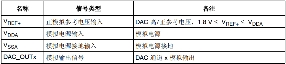 注意:使能DAC 通道x 后,相应GPIO 引脚(PA4 或PA5)将自动连接到模拟转换器输出(DAC_OUTx)。为了避免寄生电流消耗,应首先将PA4 或PA5 引脚配置为模拟模式(AIN)。
