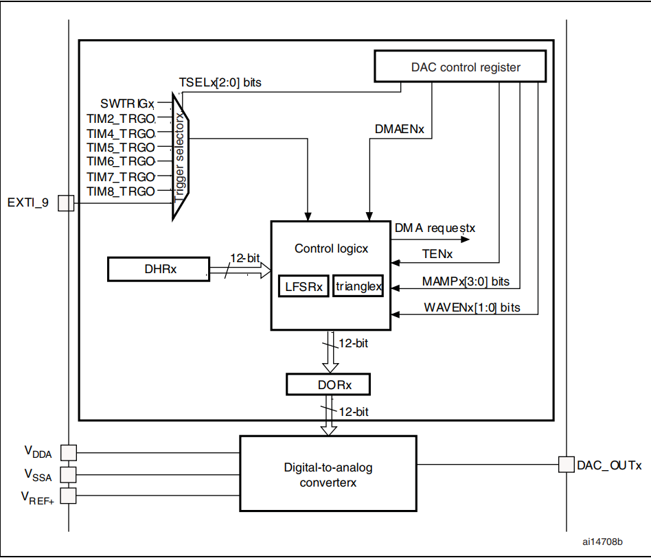 下面的简化框图显示了STM32DAC模块的主要组件。