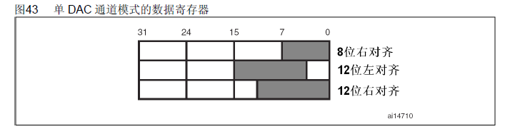 12位数据右对齐:用户须将数据写入寄存器DAC_DHR12Rx[11:0]位(实际是存入寄存器DHRx[11:0]位)。