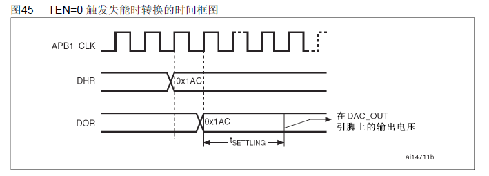 如果选中硬件触发(寄存器DAC_CR1的TENx位置1),数据传输在触发发生以后3个APB1时钟周期后完成。