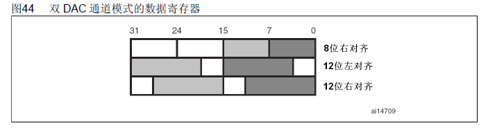 12位数据左对齐:用户须将DAC通道1数据写入寄存器DAC_DHR12LD[15:4]位(实际是存入寄存器DHR1[11:0]位),将DAC通道2数据写入寄存器DAC_DHR12LD[31:20]位(实际是存入寄存器DHR2[11:0]位);