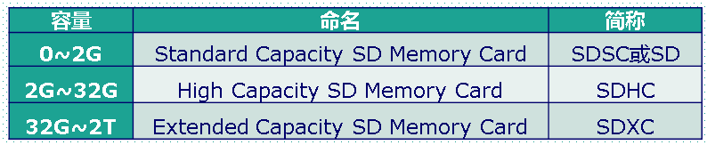 SD卡按容量分类,可以分为3类:SD卡、SDHC卡、SDXC卡,如下表所示: