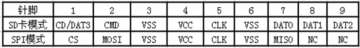 SD卡由9个引脚与外部通信,支持SPI和SDIO两种模式,不同模式下,SD卡引脚功能描述如下表所示: