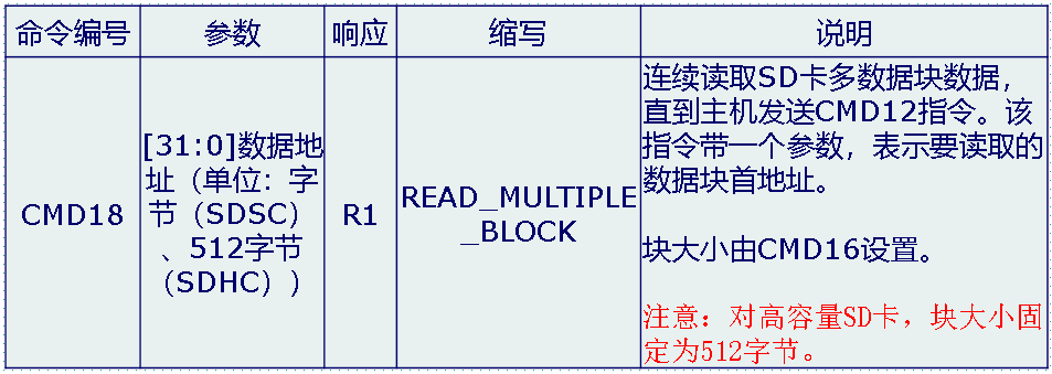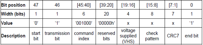 [1:0]=11),上电后发送CMD0,对卡进行软复位,之后发送CMD8命令,用于区分SD卡2.0,只有2.0及以后的卡才支持CMD8命令,MMC卡和V1.x的卡,是不支持该命令的。CMD8命令格式如下表: