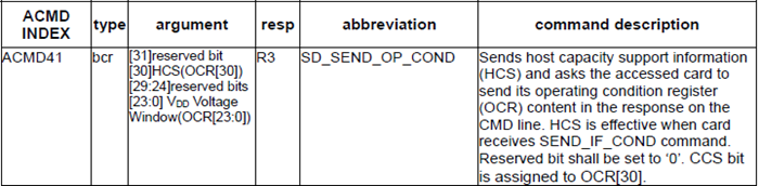 在发送CMD8后,发送ACMD41(注意:发送ACMD41之前,要先发送CMD55),来进一步确认卡的操作电压范围,并通过HCS位来告诉SD卡,主机是不是支持高容量卡(SDHC)
