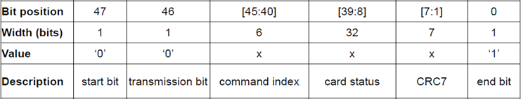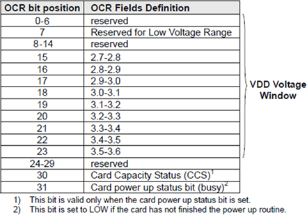 ACMD41指令响应(R3),包含了SD卡OCR寄存器内容,其定义如下表所示: