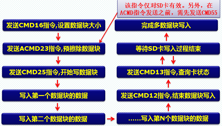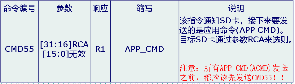 注意:发送ACMD之前,必须先发送CMD55,通知SD卡,接下来要发送的是应用命令(APPCMD),而非标准命令