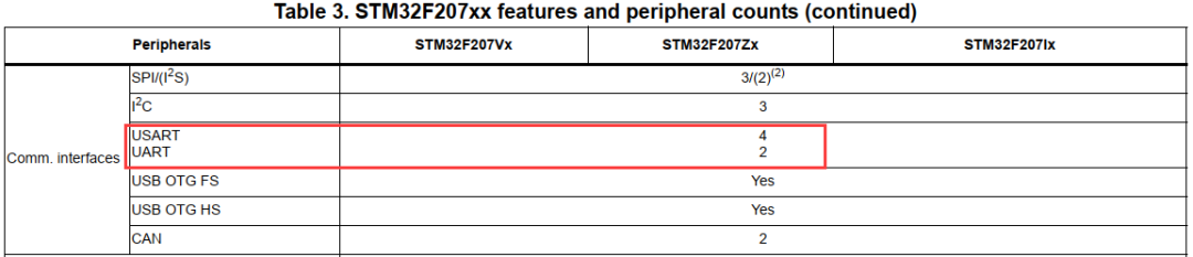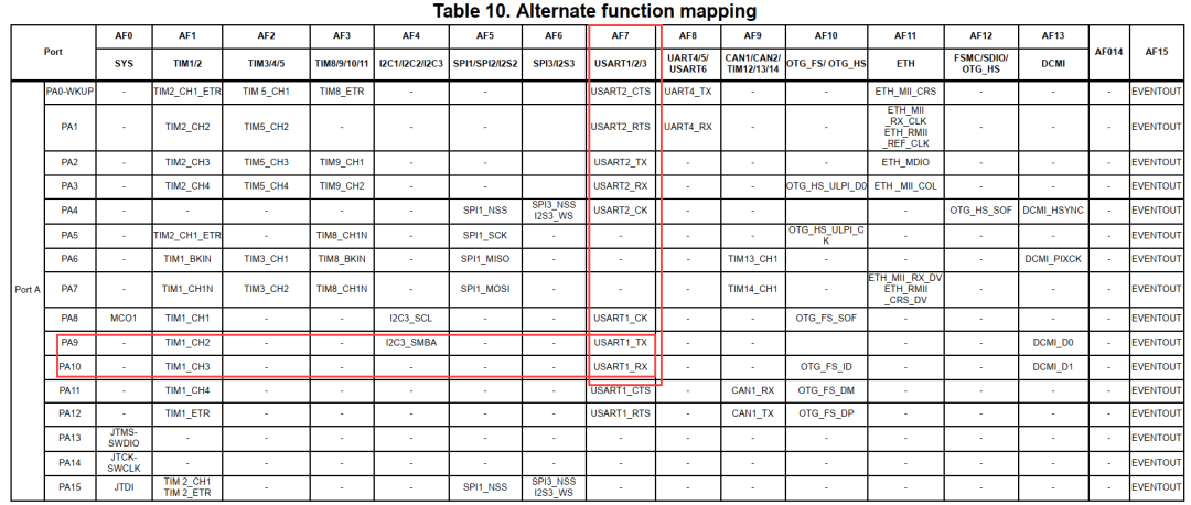 从STM32F207数据手册的Table10. Alternate functionmapping图中看到USART1的对应管脚,下文我们选择PA9和PA10作为USART1的管脚。