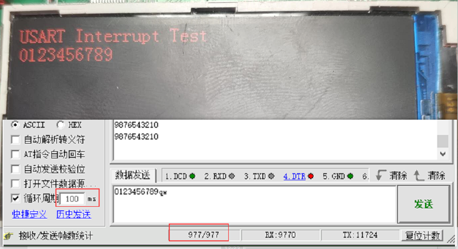 LCD显示屏可以显示接收的10个字符,且PC以100ms为间隔发送数据,发送977包收到977包回复,测试demo就够健壮,没有出现丢包。