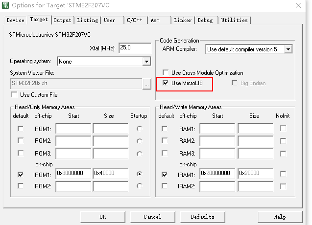 Keil配置,需要勾选MicroLIB选项。