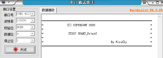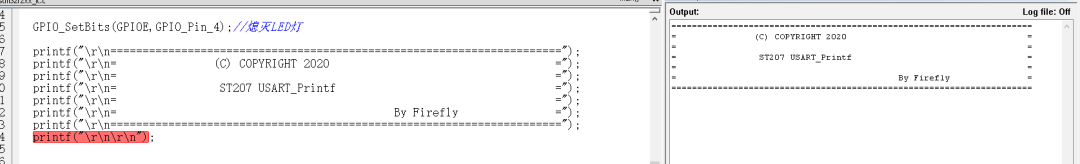 printf("\r\n======================================================================"); printf("\r\n= (C) COPYRIGHT 2020 ="); printf("\r\n= ="); printf("\r\n= ST207 USART_Printf ="); printf("\r\n= ="); printf("\r\n= By Firefly ="); printf("\r\n======================================================================"); printf("\r\n\r\n");