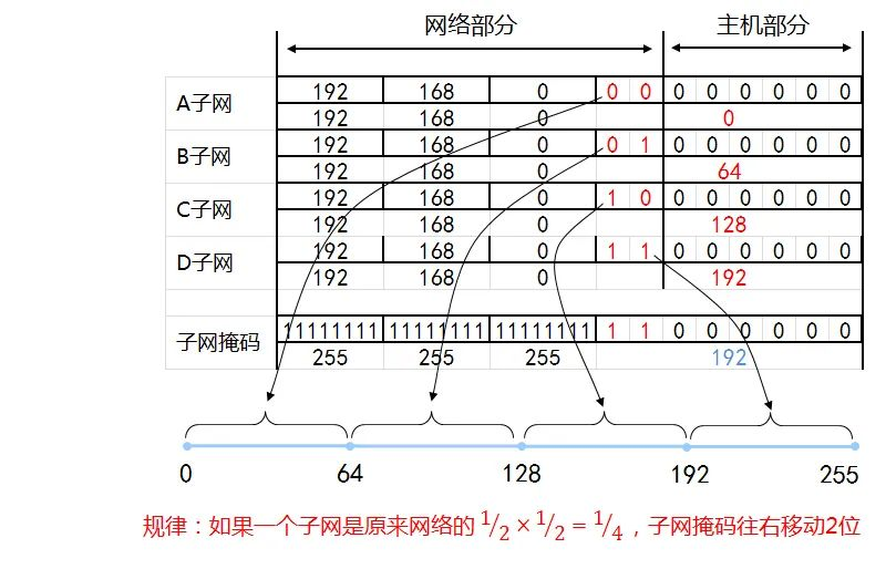 分析:要想分成4个子网,需要将子网掩码往右移动两位,这样第1位和第2位就变为网络位,就可以分成4个子网。