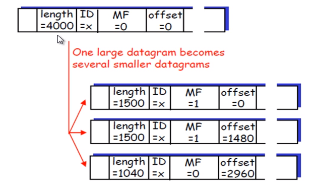 ● 标志字段中间的一位记为DF(Don’t Fragment),意思是“不能分片”。只有当DF=0时才允许分片。