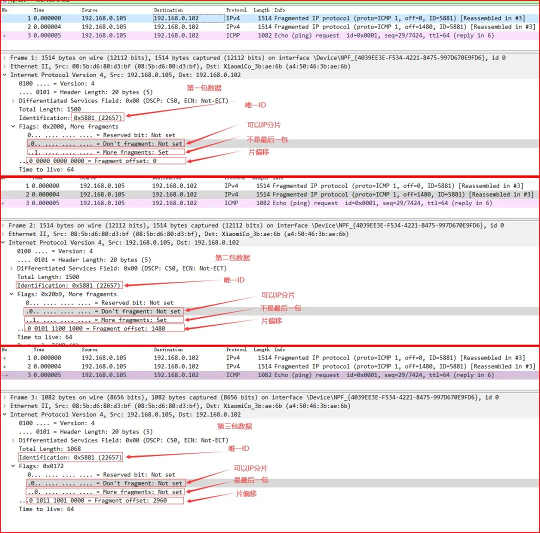 可以看到,但数据提交到网络层的时候,由于数据超过了最大传输单元,就分片了,上述图片验证了DF和MF的功能,并且验证了IP分片的数据包标识(Identification)是一致的。每个数据包最大的字节为MTU- IP头= 1500 - 20 = 1480。