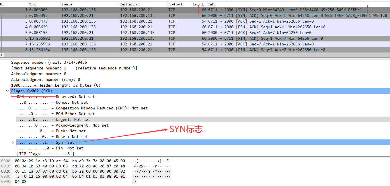 前面讲解TCP头中flg中就有SYN标志,在wireshark抓包中也有显示。