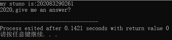 /*A simple C program*/ #include<stdio.h> int main(){ printf("my stuno is:202083290261\n"); printf("2020,give me an answer?\n"); return 0; }