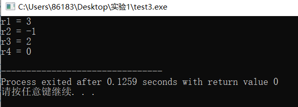 /*用c语言实现的一个简单算数运算程序*/ #include <stdio.h> int main() { int x, y; int r1, r2, r3, r4; x = 1; y = 2; r1 = x + y; r2 = x - y; r3 = x * y; r4 = x / y; printf("r1 = %d\n", r1); printf("r2 = %d\n", r2) printf("r3 = %d\n", r3); printf("r4 = %d\n", r4) return 0; }