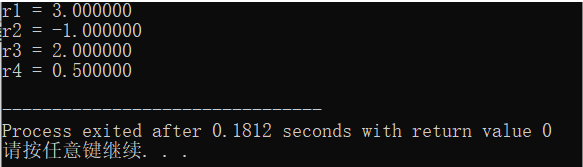 /*用c语言实现的一个简单算数运算程序*/ #include <stdio.h> int main() { float x, y; float r1, r2, r3, r4; x = 1; y = 2; r1 = x + y; r2 = x - y; r3 = x * y; r4 = x / y; printf("r1 = %f\n", r1); printf("r2 = %f\n", r2); printf("r3 = %f\n", r3); printf("r4 = %f\n", r4); return 0; }