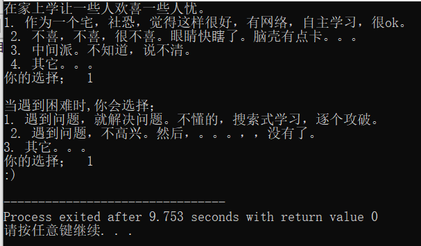//测试你是哪一类学习者 #include <stdio.h> int main(){ int answer; char words[5000]; printf("在家上学让一些人欢喜一些人忧。\n"); printf("1. 作为一个宅,社恐,觉得这样很好,有网络,自主学习,很ok。\n"); printf(" 2. 不喜,不喜,很不喜。眼睛快瞎了。脑壳有点卡。。。\n"); printf(" 3. 中间派。不知道,说不清。\n"); printf(" 4. 其它。。。\n"); printf("你的选择; "); scanf("%d", &answer); if(answer == 4){ printf("请补充说明你的想法;\n"); getchar(); gets(words); } printf("\n"); printf("当遇到困难时,你会选择;\n"); printf("1. 遇到问题,就解决问题。不懂的,搜索式学习,逐个攻破。\n "); printf("2. 遇到问题,不高兴。然后,。。。,,没有了。\n"); printf("3. 其它。。。\n"); printf("你的选择; "); scanf("%d" , &answer); if(answer == 1) printf(":)\n"); else if(answer == 2) printf("这样不能解决问题啊。。。我们选择1好不好:)\n"); else if(answer == 3){ printf("请补充说明你的想法;\n"); getchar(); gets(words); } return 0; }