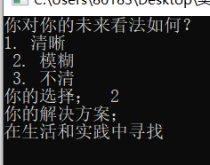//测试你是哪一类学习者 #include <stdio.h> int main(){ int answer; char words[5000]; printf("你对你的未来看法如何?\n"); printf("1. 清晰\n"); printf(" 2. 模糊\n"); printf(" 3. 不清\n"); printf("你的选择; "); scanf("%d", &answer); if(answer == 2 ){ printf("你的解决方案;\n"); getchar(); gets(words); } return 0; }