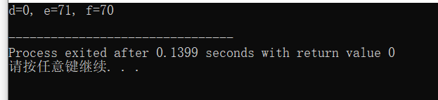 // 1 .cpp #include <stdio.h> int main(){ int a=5, b=7, c=100, d, e, f; d=a/b*c; e=a*c/b; f=c/b*a; printf("d=%d, e=%d, f=%d\n",d,e,f); return 0; }