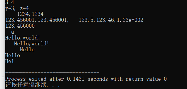 // ! #include <stdio.h> int main(){ int x=1234; float f=123.456; double m=123.456; char ch='a'; char a[]="Hello,world!"; int y=3, z=4; printf("%d %d\n",y,z); printf("y=%d, z=%d\n",y,z); printf("%8d,%2d\n",x,x); printf("%f,%8f,%8.1f,%0.2f,%.2e\n",f,f,f,f,f); printf("%1f\n",m); printf("%3c\n",ch); printf("%s\n%15s\n%10.5s\n%2.5s\n%.3s\n",a,a,a,a,a); return 0; }