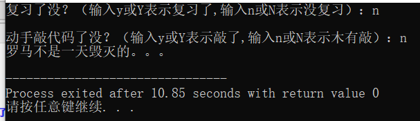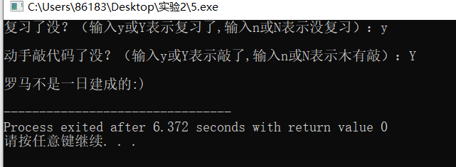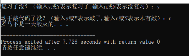 //5 #include <stdio.h> int main() { char ans1, ans2; printf("复习了没?(输入y或Y表示复习了,输入n或N表示没复习):"); ans1 = getchar(); getchar(); printf("\n动手敲代码了没?(输入y或Y表示敲了,输入n或N表示木有敲):"); ans2 = getchar(); if((ans1=='y'||ans1=='Y')&&(ans2=='y'||ans2=='Y')) printf("\n罗马不是一日建成的:)\n"); else printf("罗马不是一天毁灭的。。。\n"); return 0; }
