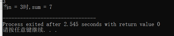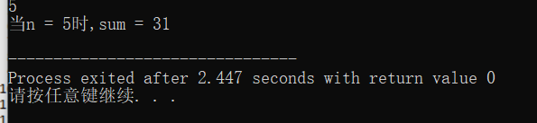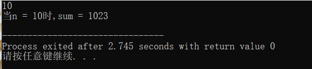 //6 #include <stdio.h> #include <math.h> int main (){ int n,sum,q=2; scanf("%d",&n); sum=1*(1-pow(q,n))/(1-q); printf("当n = %d时,sum = %d\n",n,sum); return 0; }