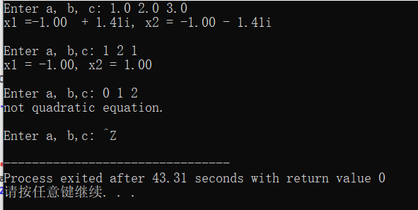 // 一元二次方程求解 //ctrl+z结束 #include <math.h> #include <stdio.h> int main() { float a, b, c, x1, x2; float delta, real, imag; printf("Enter a, b, c: "); while(scanf("%f%f%f", &a, &b, &c) != EOF){ if(a == 0) printf("not quadratic equation.\n\n"); else{ delta = b*b - 4*a*c; if(delta >= 0){ x1 = (-b + sqrt(delta))/(2*a); x2 = (b + sqrt(delta))/(2*a); printf("x1 = %.2f, x2 = %.2f\n\n", x1, x2); } else{ real = -b/(2*a); imag = sqrt(-delta)/(2*a); printf("x1 =%.2f + %.2fi, x2 = %.2f - %.2fi\n\n", real, imag, real, imag); } } printf("Enter a, b,c: "); } return 0; }