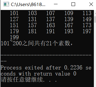 //3 #include <stdio.h> #include <math.h> int main() { int n,i,m,N=0; for(n=101;n<=200;n++) { m=sqrt(n); for(i=2;i<=m;i++) { if(n%i==0)break; if(i==m){ printf("%6d",n); N++; } } } printf("\n101~200之间共有%d个素数,\n",N); return 0 ; }