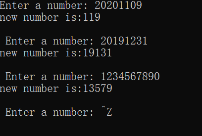 #include <stdio.h> #include<stdlib.h> int main(){ long s,t = 0; int i = 1,j; printf("Enter a number: "); while(scanf("%ld",&s)!= EOF) { i=1,t=0; while(s > 0) { j = s % 10; s = s / 10; if(j % 2 ==1) { t = t + j * i; i = i * 10; } } printf("new number is:%ld\n\n ",t); printf("Enter a number: "); } return 0; }