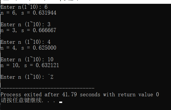 #include <stdio.h> int main(){ int n; printf("Enter n(1~10): "); while(scanf("%d", &n)!=EOF){ int t, f, T; f = 1; T = 1; double s = 0.0; for (t = 1;t <= n; t++){ T = t * T; s = s + f * (1.0 / T); f = f * (-1); } printf("n = %d, s = %f\n\n", n, s); printf("Enter n (1~10): "); } }